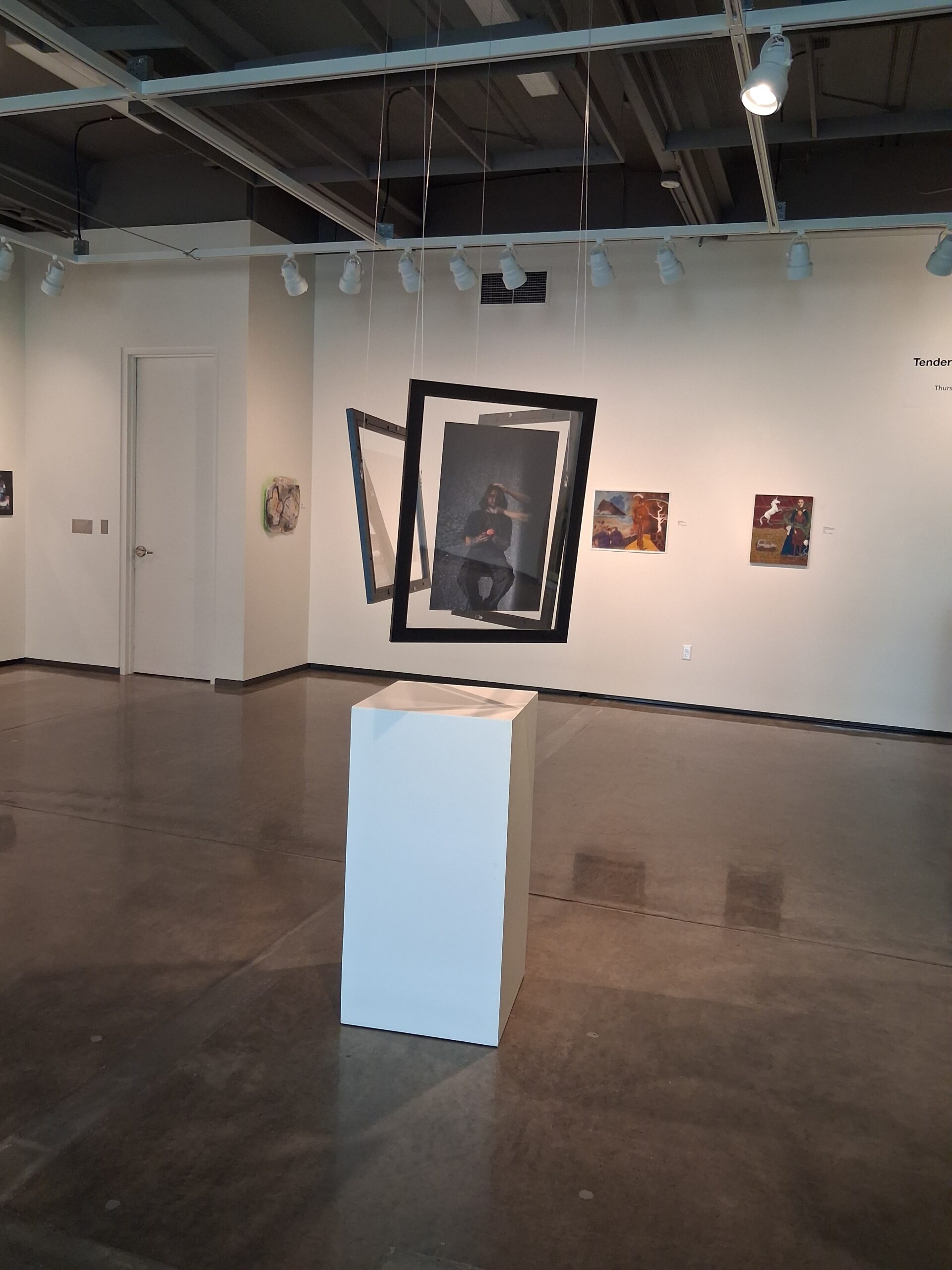 Cole’s art is hung from the ceiling to invoke a feeling of “vertigo” caused by the floating art and lighting. These pieces are multimedia self portraits. “It spills” is the favored piece, “I don’t really have a reason”, Cole says.